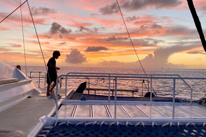 The Sunset Sail on our 55′ luxury sailing catamaran is truly unbeatable, offering unobscured views of Waikiki’s coastline. As the sun dips below the horizon, you’ll watch the sky light up with brilliant shades of orange, pink, and purple. If you’re lucky you might even spot the green flash!