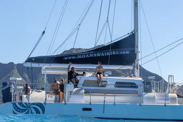When you’re ready for a break, hop back aboard our luxury 55′ Moana Catamaran. Relax on our spacious lounge nets, sip a refreshing drink from our premium onboard bar, and take in the breathtaking views of Waikiki’s coastline. The atmosphere is relaxed and welcoming—perfect for soaking up the sun.